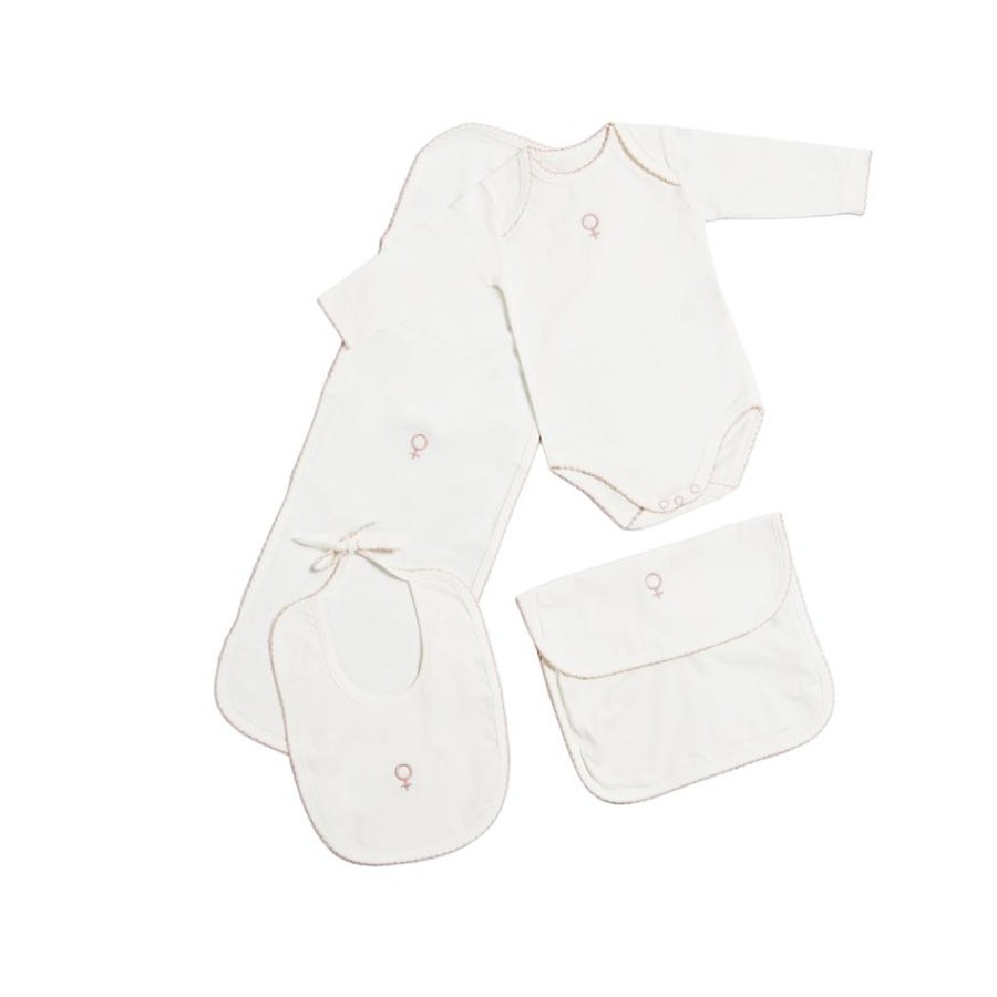 Bolsa de algodón orgánico que contiene un body T 0-1m, un babero y una gasa para el hombro. Todo bordado con el signo femenino en rosa. La bolsa es también muy útil para guardar cosas.